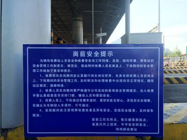 雞鳴驛收費(fèi)站制作崗前安全提示牌提醒上崗人員安全作業(yè)
